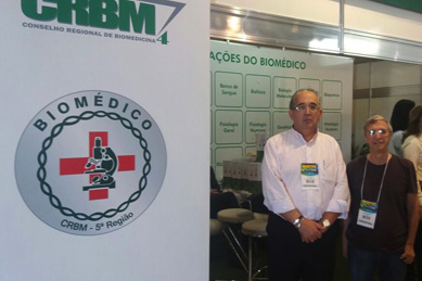 Na foto, os drs. Luiz Guedes e Pérsio Ebner, presidente e secretário-geral do SINBIESP, em estande da Biomedicina
